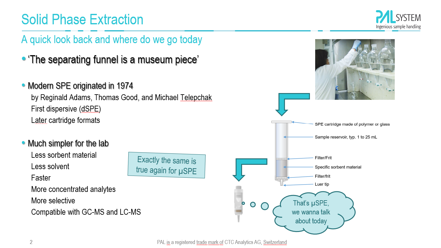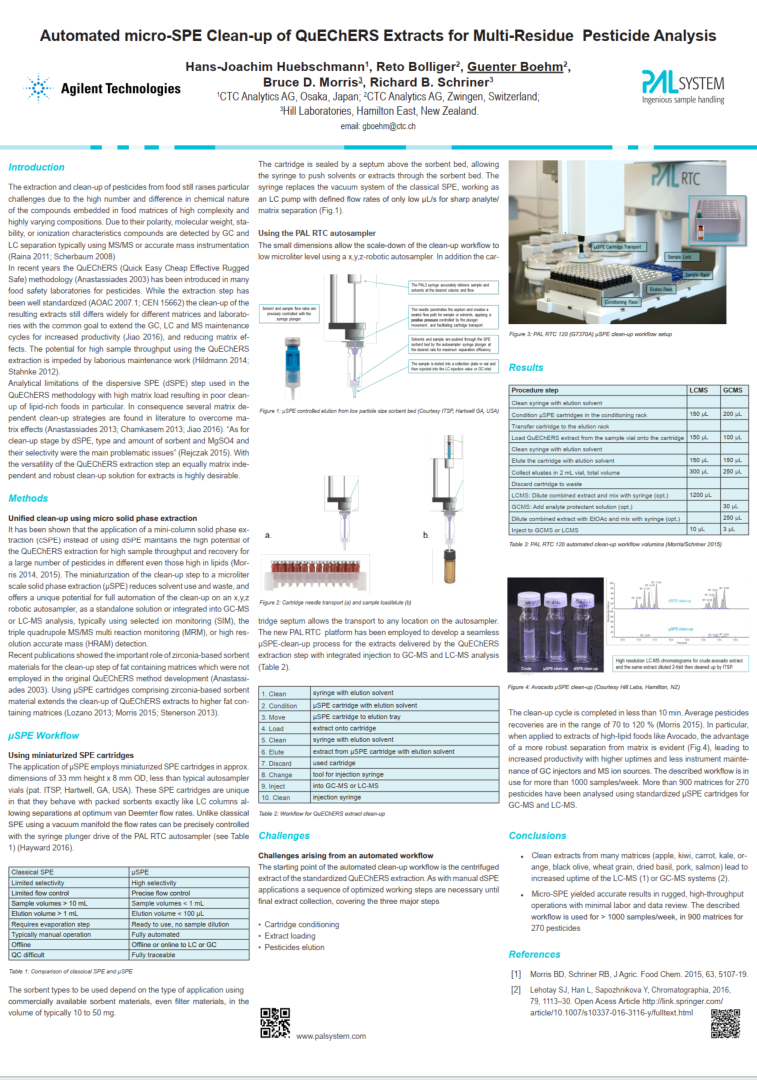 | Keywords: QuEChERS, QuPPe, pesticide analysis, extract clean-up, automation, LC-MS, GC-MS, food, environment How advantageous would it be to use an automated sample preparation setup for food, beverage and environmental samples? For a sustainable and green sample preparation we want to save consumables, solvents, and for sure this also reduces expenses. And, its possible, save the investment for additional instrument. Micro-SPE is the solution today. SPE is well-known. A huge number of applications and all sorts of sorbent materials. There is the classical enrichment mode aka load-wash-elute process, and also the scavenging mode load-elute in use. Scaling down the size of SPE allows us to do SPE as a micromethod, which is then called micro-SPE, or in short using the micro sign µSPE. This µSPE approach is not new. It used since more than 10 years in commercial laboratories for pesticides and forensics applications. The current efforts for a greener analytical chemistry also made the large instrument manufacturer aware of this nice possibility to get on a greener footprint and provide a faster and more reliable sample prep solution for their customers. CTC Analytics in Switzerland developed a new µSPE cartridge that is available with the required sorbent materials for food, environmental or pharmaceutical analysis. |