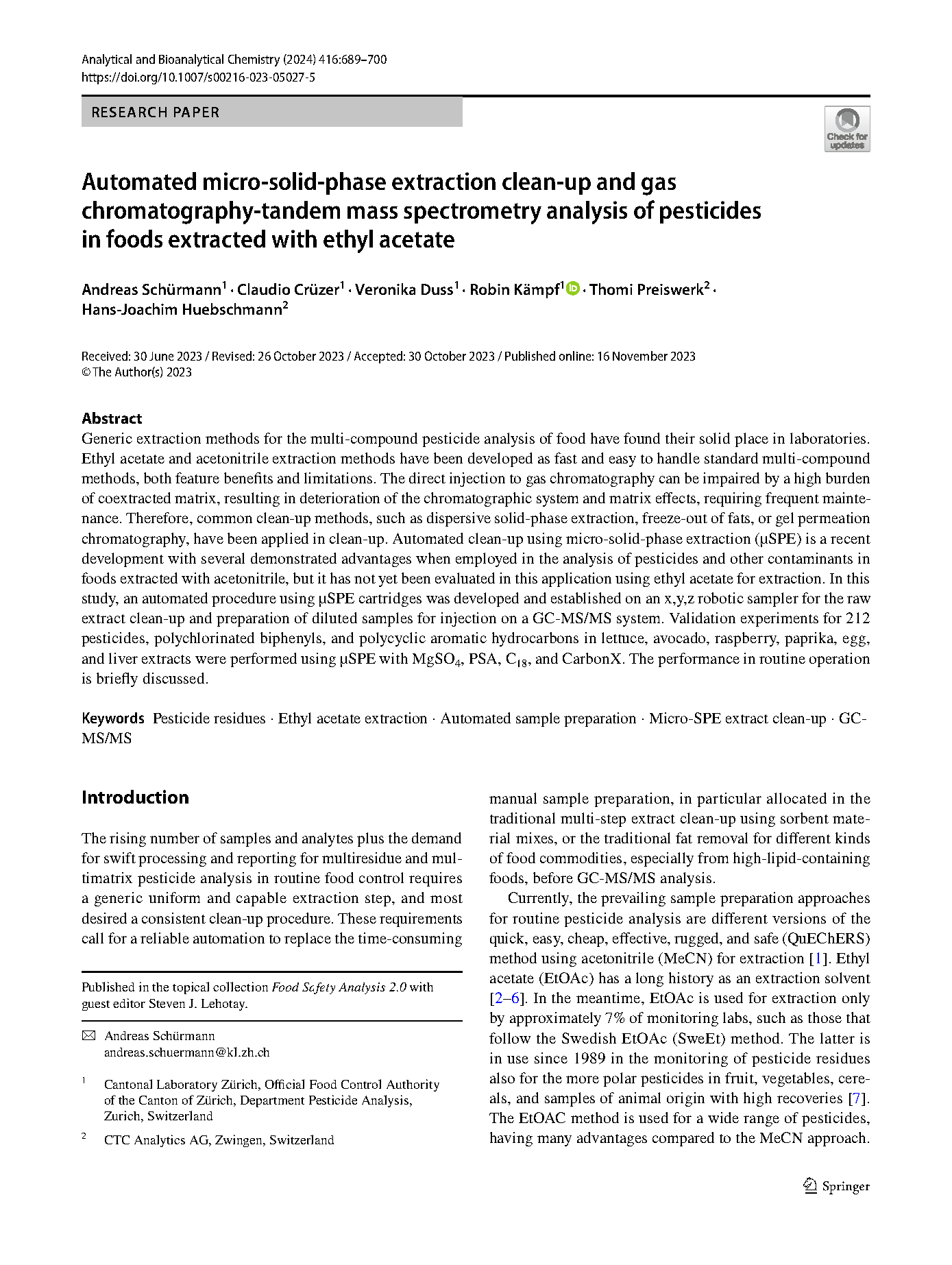 Andreas Schürmann1 · Claudio Crüzer1 · Veronika Duss1 · Robin Kämpf1 · Thomi Preiswerk2 · Hans‑Joachim Huebschmann2 1 Cantonal Laboratory Zürich, Official Food Control Authority of the Canton of Zürich, Department Pesticide Analysis, Zurich, Switzerland 2 CTC Analytics AG, Zwingen, Switzerland. |