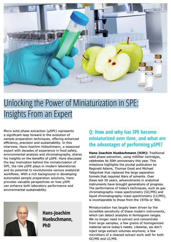 | Keywords: micro-SPE, µSPE, QuEChERS, QuPPe, pesticide analysis, extract clean-up, automation, LC-MS, GC-MS, food, environment, veterinary drugs, filtration Micro solid phase extraction (µSPE) represents a significant leap forward in the evolution of sample preparation techniques, offering enhanced efficiency, precision and sustainability. In this interview, Hans-Joachim Hübschmann, a seasoned expert with decades of experience in food safety, environmental analysis and chromatography, shares his insights on the benefits of µSPE. Hans discusses the key motivation behind the miniaturization of SPE, the role µSPE plays in modern laboratories and its potential to revolutionize various analytical workflows. With a rich background in developing automated sample preparation solutions, Hans provides valuable perspectives on how µSPE can enhance both laboratory performance and environmental sustainability. |